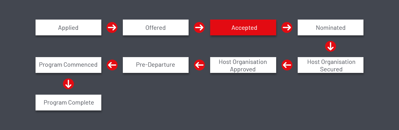 Note for Swinburne team - these tasks are dynamic. Once something is complete, the tick will appear, but if it is incomplete (based on the student's record in OP) it will show a button to complete the task (e.g. Acceptance form, upload Host Acceptance). If a student completes something like uploading a document, we can generate a notification to you for checking. In addition, these tasks may only appear when the student is 'ready' to do those tasks. For example, a student in the initial stages of applying won't be asked to complete their program feedback.
